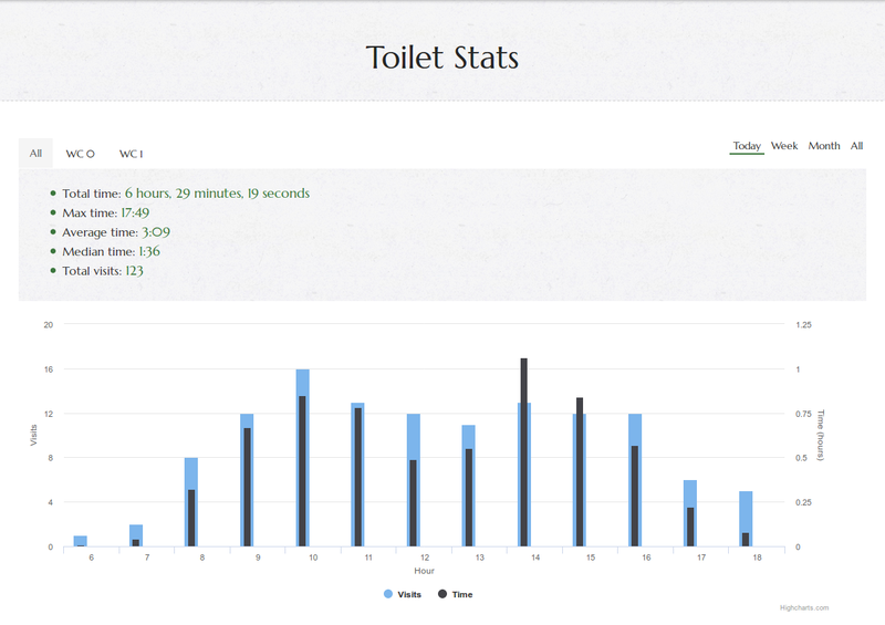 As you can see, it also displays you the total time of the bathrooms is being using and the last usage of time every bathroom (this could be useful for many reasons). The systems is prepared to add more toilets dynamically.